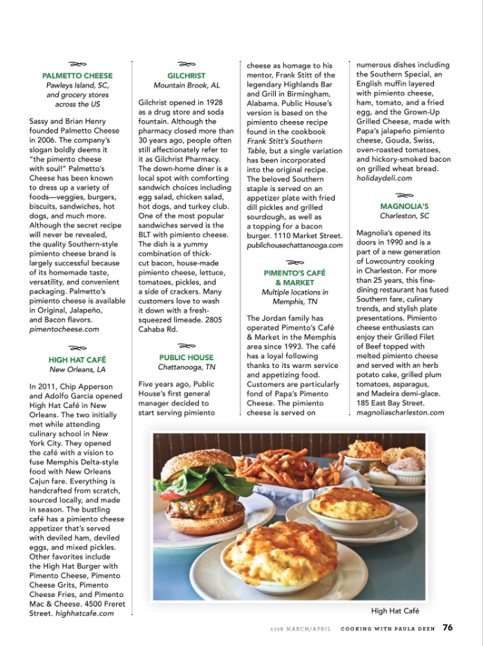 Palmetto Cheese was featured as one of the “TEN TO TRY – Pimiento Cheese” in the March/April 2016 issue of Cooking with Paula Deen Magazine.